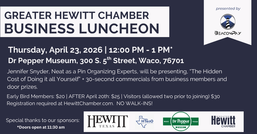 Join us for our business networking luncheon. Jennifer Snyder, Neat as a Pin Organizing Experts, will present."The HIdden Cost of Doing it all Yourself" + 30 second commercials, door prizes and plenty of networking! Registration required, NO WALK_INS! Early bird registration price is available through April 20th.