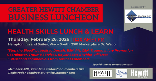 Join us for this hands-on lunch and learn led by Melissa Dorsch and her team from BSW Hillcrest Trauma Services. The program will cover stop the bleed skills, basic CPR (chest compressions only) and tips for treating heat exhaustion. We’ll have 30-second commercials from business members after the program.