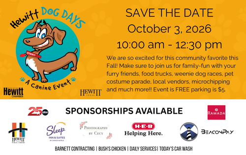 Please note that advertising/sponsorships/vendor reservations are not refundable as dollars go toward ongoing community development efforts. By registering, I will not hold the Greater Hewitt Chamber, City of Hewitt or its members, committee, staff or volunteers responsible for damages or injury incurred during the Dog Days of Summer event on Oct 3, 2026.
