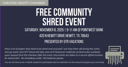Join us on Saturday, November 8th for a Free Community Shred Event by HOT Shred. Special thanks to GTR Vacations for sponsoring this event!